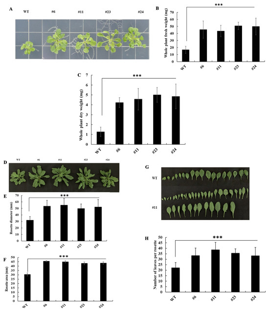 Overexpression of KfNAC83 in Arabidopsis increases plant biomass. (A) T2 homozygous seeds of transgenic lines and wild type (WT) were grown on MS basal medium for three weeks. (B) Whole-plant fresh weight and (C) dry weight (n = 20) were measured after 21 days of growth. (D) Representative images of four-week-old, detached rosettes from transgenic lines and WT. (E) Rosette diameter and (F) rosette area were quantified using ImageJ (n = 20). (G) Representative image of detached leaves from a four-week-old rosette of KfNAC83-overexpressing line (#11) and WT. (H) Number of leaves per rosette in transgenic lines and WT (n = 20). Values represent means ± SE. *** p < 0.001. WT = wild type; #6, #11, #23, and #24 = independent transgenic lines.