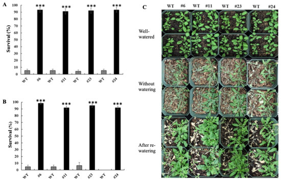 To evaluate water-deficit tolerance, OxKfNAC83 transgenic lines and WT plants were subjected to acute water-deficit treatments lasting 15 and 20 days, following an initial 14 day period of well-watered growth. After a 7 day recovery period with re-watering, OxKfNAC83 lines exhibited over 90% survival, whereas only 4–6% of WT plants recovered under either the 15 day (Figure 2A) or 20 day (Figure 2B,C) treatment conditions. These results demonstrate that overexpression of KfNAC83 significantly enhances water-deficit tolerance in transgenic plants.