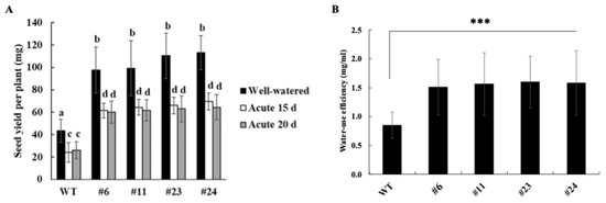 KfNAC83 overexpression improves seed yield and water-use efficiency (WUE). (A) Seed yield per plant was measured under normal conditions and after 15- and 20-day water-deficit stress treatments. (B) WUE was calculated from water loss and shoot dry weight in four-week-old plants (n = 25). Error bars represent ± SE from three independent experiments. Bars with the same letters are not significantly different (p < 0.001); different letters indicate significant differences. *** p < 0.001. WT = wild type; #6, #11, #23, and #24 = independent transgenic lines.