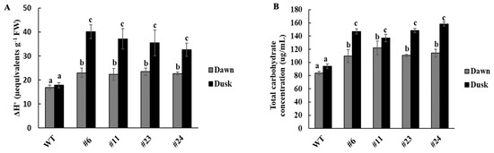 OxKfNAC83 lines accumulate more organic acids and carbohydrates. T2 homozygous seeds of OxKfNAC83 lines and WT were grown on soilless medium for four weeks under a 12 h photoperiod. (A) Titratable acidity was measured to quantify organic acid content (n = 3). (B) Total soluble sugar concentration was measured at dawn and dusk (n = 3). Values represent means ± SE. Bars with the same letters are not significantly different (p < 0.001); different letters indicate significant differences. WT = wild type; #6, #11, #23, and #24 = independent transgenic lines.