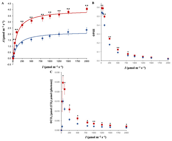 Net photosynthetic light-response (A/I) analysis of OxKfNAC83 and WT plants. (A) Net CO2 assimilation rate (A), (B) Quantum yield of Photosystem II (ΦPSII), and (C) Quantum yield of CO2 (ΦCO2) were measured across a range of irradiance (I). Data are from T2 progeny of line #24 and WT (n = 3 per treatment). Solid lines: red = OxKfNAC83, blue = WT. Symbols: red squares = OxKfNAC83, blue circles = WT. Error bars represent standard error of the mean. * p < 0.05, ** p < 0.01.