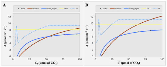 The response of net photosynthesis (A) to intercellular CO2 concentration (Ci) was also measured using the LI-6800 system to determine carboxylation efficiency. Measurements were conducted at a saturating photosynthetic photon flux density (PPFD) of 200 μmol m−2 s−1. CO2 concentration (Ca) was initially set at 400 μmol mol−1, then decreased stepwise to 300, 200, 100, and 50 μmol mol−1, followed by increases to 100, 200, 300, 400, 500, 700, 900, 1000, and 1500 μmol mol−1. Three leaves per plant were measured, and the average was used per replicate. CO2 assimilation rate and Ci were calculated using the equations of von Caemmerer and Farquhar [40]. Maximum rates of Rubisco carboxylation (Vcmax), electron transport for RuBP regeneration (Jmax), and triose phosphate utilization (TPU) were estimated at 25 °C using equations from Sharkey et al. [41].