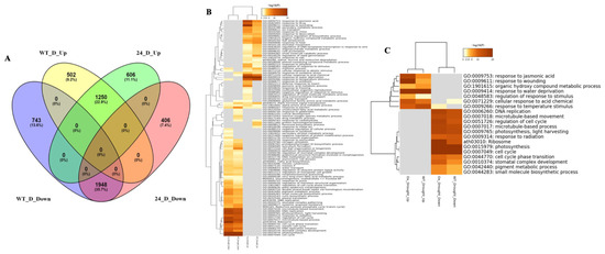 Differentially expressed genes (DEGs) and gene ontology (GO) enrichment in a OxKfNAC83 line. (A) Venn diagram showing increased and decreased DEGs in OxKfNAC83 line #24 compared to WT. (B) Top 100 and (C) top 20 enriched GO terms among DEGs, categorized by biological process, presented in hierarchical clusters.