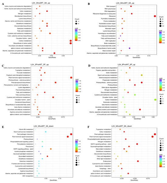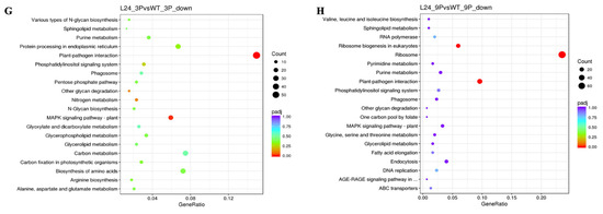 KEGG pathway enrichment analysis of DEGs in a OxKfNAC83 line. KEGG pathway enrichment scatter plots for significantly increased genes in (A) L24_3A vs. WT_3A, (B) L24_9A vs. WT_9A, (C) L24_3P vs. WT_3P, and (D) L24_9P vs. WT_9P; and for decreased genes in (E) L24_3A vs. WT_3A, (F) L24_9A vs. WT_9A, (G) L24_3P vs. WT_3P, and (H) L24_9P vs. WT_9P. The x-axis indicates the rich factor; the y-axis lists KEGG pathway names. Dot size represents the number of genes; dot color indicates q-value. Top 20 enriched pathways are shown.