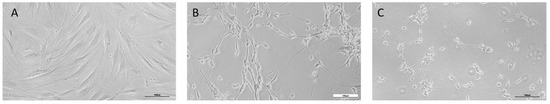 Conversion of FetMSCs into induced neurons. Representative microscopy images depicting the morphological changes after microRNA induction. (A)—without lentiviral transduction; (B)—13 days after lentiviral transduction; (C)—21 days after lentiviral transduction. Phase-contrast microscopy, ×10. Scale bar: 100 µm.