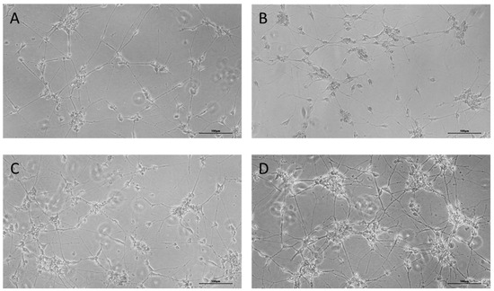 Cell morphology after application of short peptides for 10 days. Representative microscopy images of induced neurons in control cells (A) and after application of AEDG (B), EDR (C), and KED (D) peptides. Phase-contrast microscopy, ×10. Scale bar: 100 µm.