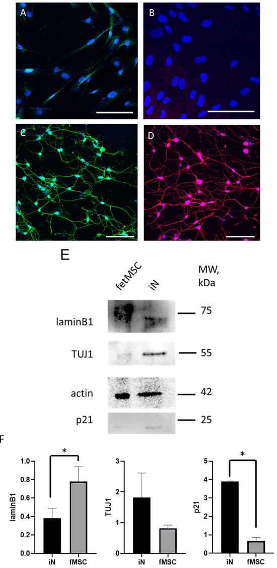 FetMSCs and induced neurons obtained from them were lysed for 30 min on ice in a RIPA buffer (ServiceBio, Wuhan, China, Cat№G2002), supplemented with a protease inhibitor at a concentration of 1 mg/mL (ThermoScientific, Waltham, MA, USA, Cat№78429). Probes were separated in a 10% SDS polyacrylamide gel, transferred onto a PVDF membrane (Bio-Rad, Hercules, CA, USA, Cat№1620264), blocked, and incubated overnight with primary antibodies to actin (ServiceBio, Cat№GB12001, dilution: 1/500), TUJ-1 (R&D Systems, Cat№ MAB1195, dilution: 1/2000), MAP2 (Abcam, cat-alog number ab ab281588, dilution: 1/2000), p21 (ELK Biotechnology, CAt№ EA236, dilution: 1/500), and laminB1 (Novus, Cat№ NBP2-59783, dilution: 1/1000). The membrane was washed several times with a PBS buffer supplemented with 0.1% polysorbate 20 (ApplyChem, Darmstadt, Germany, Cat№A4974), and then incubated with horseradish peroxidase-conjugated secondary antibodies (Bio-RAD, Cat№ 1706516, 1706515, dilution: 1/3000) for 1 h. After several washes to remove unbound secondary antibodies, the membrane was incubated in a SuperSignal West Pico PLUS Chemilumonescence Substrate (ThermoScientific, Cat№ 34577), and the signal was detected using a Chemidoc system. Analysis of the data from three batches of cultures was performed using ScionImage software (Scion Image 4.0.3.2). The mean density of each band was normalized to actin signal in the same sample and averaged. These values were normalized to fetMSC intensity for every batch of cells.