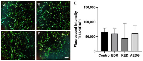 Our previous experiments showed that short peptides are able to modulate neurogenesis in neuronal progenitors derived from hPDLSC cells [35]. Hence, we first analyzed the effects of short peptides on the expression of the canonical neuronal marker TUJ-1 in induced neurons derived from FetMSCs. According to the obtained results, all three peptide bioregulators do not cause a statistically significant increase in the level of TUJ-1 protein expression in induced neurons obtained from FetMSCs compared to the control. In the control, the level of TUJ-1 expression was 65,484 ± 32,066, while after application of the AEDG peptide, the level of TUJ-1 was 60,969 ± 44,168, after application of the EDR peptide, a decrease in the protein level to 60,455 ± 62,536 was observed, and after application of the KED peptide, a decrease to 44,413 ± 31,258 was observed (Figure 4).