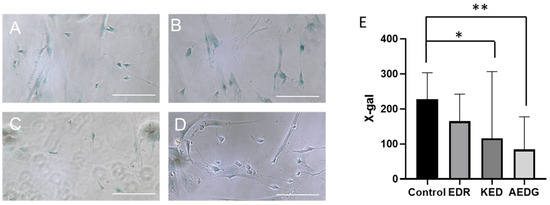 Staining of induced neurons obtained from FetMSCs for beta-galactosidase in control (A) and after application of AEDG (B), EDR (C), or KED (D) peptide. Light microscopy, ×20. Scale bar: 100 µm. (E) Bar plots illustrating the beta-galactosidase activity count in induced neurons derived from FetMSCs. Data are presented as median ± interquartile range. * p < 0.05; ** p < 0.01. Kruskal–Wallis test followed by Dunn’s post hoc analysis.