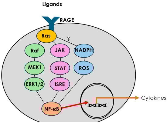 RAGE signaling pathways leading to cytokine release. Ligand binding to the receptor for advanced glycation end products (RAGE) activates Ras and initiates multiple intracellular signaling cascades. The Ras/Raf/MEK/ERK1/2 pathway, together with JAK/STAT/ISRE signaling, converge on NF-κB activation. In parallel, RAGE stimulation engages NADPH oxidase, generating reactive oxygen species (ROS) that further enhance NF-κB activity. Activated NF-κB translocates to the nucleus, driving transcription of pro-inflammatory cytokine genes.