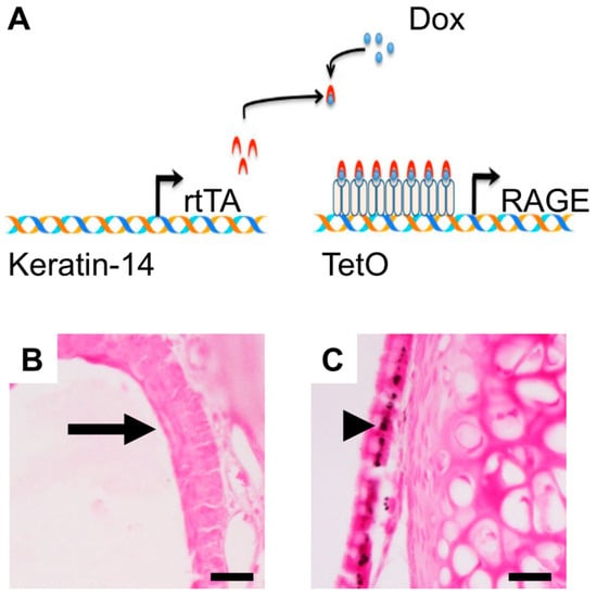 The functionality of the doxycycline-inducible RAGE overexpression system was confirmed in K14-rtTA/tetO-RAGE (RTG) mice (Figure 2A). Histological examination in our previous manuscript [] revealed epithelial thickening and goblet cell hyperplasia in sinonasal tissue from both RTG and wild-type mice exposed to SHS (WT SHS) compared to wild-type room air controls (WT RA). Representative sections stained for RAGE revealed no immunoreactivity in sinus epithelium from control mice (Figure 2B, arrow) and string RAGE immunostaining in sinus epithelium from RTG mice (Figure 2C, arrowhead).