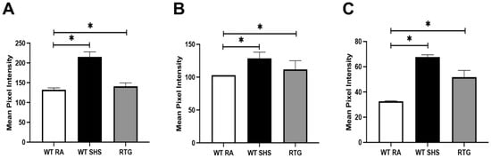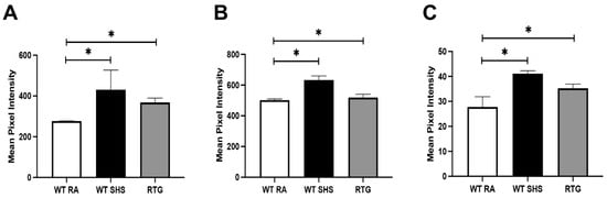 Dot blot analysis demonstrated significantly elevated levels of TNF-α in both the WT SHS and RTG groups compared to WT RA (p < 0.05; Figure 3A). Specifically, the TNF-α mean pixel intensity was ~200 in SHS and ~145 in RTG mice versus ~130 in controls. IL-1β levels were also significantly increased in the SHS group (p < 0.05 vs. WT RA), with a significant elevation also observed in RTG mice compared to controls (Figure 3B). Similarly, IFN-γ expression was significantly higher in both SHS (p < 0.01) and RTG mice (p < 0.05) compared to controls (Figure 3C), consistent with Th1 pathway activation.