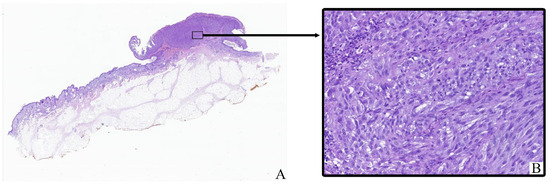 Patient L., male, 55 years. Invasive melanoma, 8743/3 superficial spreading subtype, Breslow thickness 2.1 mm (pT3b). (A)—histoscan; (B)—tumor. Staining: hematoxylin and eosin, magnification ×400.