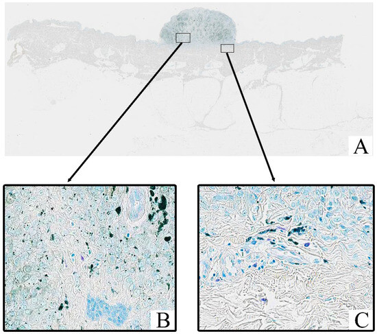 Patient I., female, 88 years. Invasive melanoma, 8721/3 nodular subtype, Breslow thickness 1.8 mm (pT2a). (A)—histoscan; (B)—intratumoral tissue; (C)—peritumoral tissue. Staining: Toluidine Blue, magnification ×400.