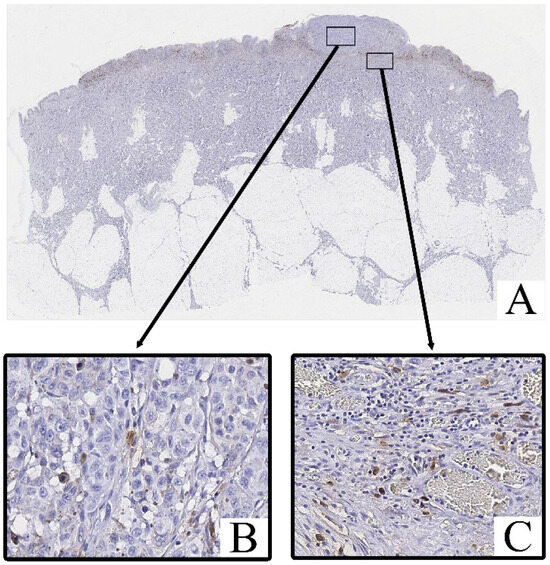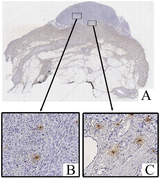 Patient G., male, 53 years. Invasive melanoma, 8743/3 superficial spreading subtype, Breslow thickness 1.6 mm (pT2b). (A)—histoscan; (B)—intratumoral tissue; (C)—peritumoral tissue. Immunohistochemical reaction with antibodies to Chymase, magnification ×400.