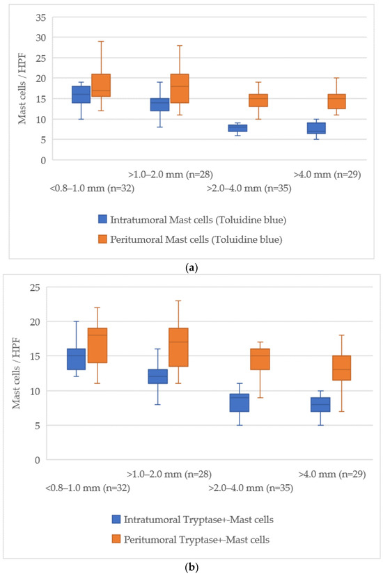 At a tumor thickness of less than 1.0 mm (<0.8–1.0 mm), the mean number of intratumoral mast cells stained with Toluidine Blue was 15 [13–18], while for tumors thicker than 4.0 mm, this value dropped to 7 [6–9], indicating an absolute decrease of about 8 cells. The peritumoral zone exhibited a similar trend, with a decrease from 18 [16–20] at less than 1.0 mm to 14 [13–16] at more than 4.0 mm, reflecting a decrease of about 4 cells.