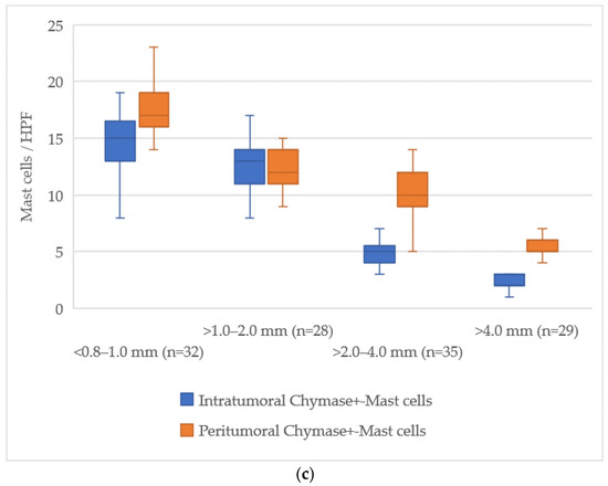 Distribution of mast cell counts by tumor thickness according to pT stage (p < 0.05). (a)—toluidine blue; (b)—Tryptase; (c)—Chymase.