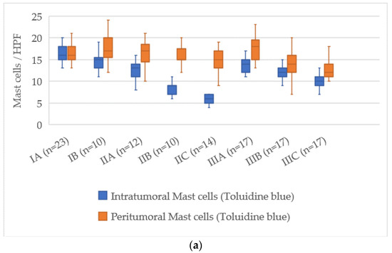 At AJCC stage IA, the number of intratumoral mast cells stained with Toluidine Blue was 16 [14–18], which decreased to 7 [6–8] at stage IIIC, reflecting a reduction of about 9 cells. In the peritumoral zone, the values decreased from 18 [16–20] at stage IA to 14 [13–16] at stage IIIC, with a reduction of about 4 cells.
