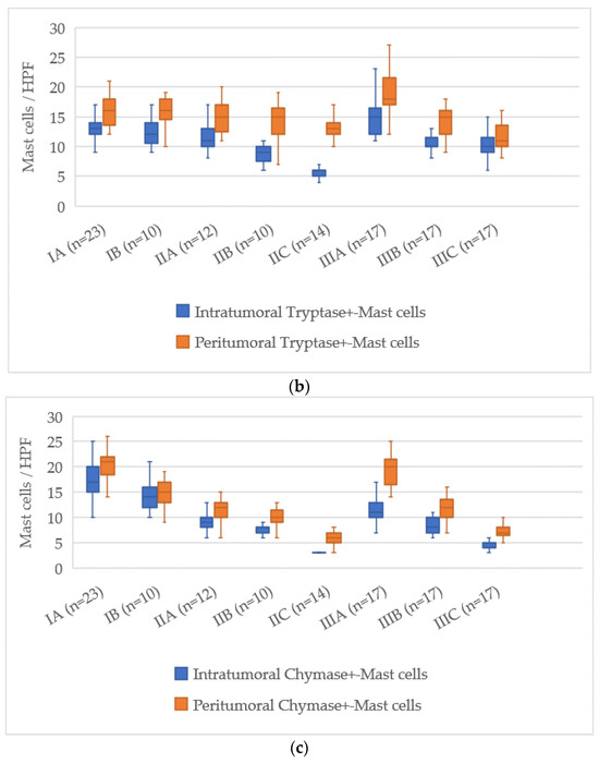 Correlation of mast cell count with tumor thickness according to AJCC stage (p < 0.05). (a)—toluidine blue; (b)—Tryptase; (c)—Chymase.