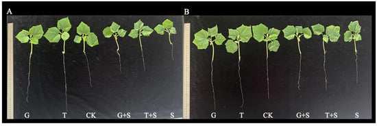 The growth phenotypes of cucumber seedlings under salt stress with exogenous sugars. Note: After different pretreatments, the seedlings were subjected to salt stress (150 mmol·L−1 NaCl) or non-salt stress for 6 days. CK: control; S: salt treatment; G: pretreated with 0.5 mmol·L−1 Glc; T: pretreated with 0.5 mmol·L−1 Suc; G + S: salt treatment after pretreatment with 0.5 mmol·L−1 Glc; T + S: salt treatment after pretreatment with 0.5 mmol·L−1 Suc. (A): Jinyou 1; (B): Xintaimici.