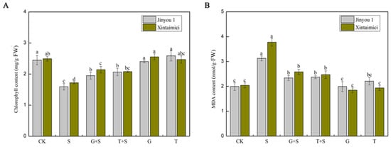 Chlorophyll is a critical photosynthetic pigment in plants, and its content directly influences the efficiency of photosynthesis in leaves. Under salt stress conditions, chlorophyll degradation occurs, leading to leaf chlorosis and a decline in photosynthetic efficiency, which ultimately inhibits plant growth and development []. This study investigated the effects of exogenous sugars on chlorophyll content in two cucumber cultivars (Xintaimici and Jinyou 1) under salt stress. As illustrated in Figure 2A, salt stress significantly reduced chlorophyll levels in both cultivars. However, exogenous sugar treatments (G + S and T + S) markedly increased chlorophyll content under salt stress conditions. Compared with the salt-stressed group (S), G + S and T + S treatments increased chlorophyll content in Xintaimici by 30.23% and 32.56%, respectively, and in Jinyou 1 by 13.23% and 14.29%, respectively. These findings suggest that exogenous sugars help maintain chlorophyll stability and alleviate the inhibitory effects of salt stress on photosynthesis. Malondialdehyde (MDA) is a widely used biochemical marker for oxidative stress and reflects the extent of membrane lipid peroxidation in plants. As one of the major byproducts of lipid peroxidation, MDA not only indicates oxidative damage but also exacerbates membrane injury []. As shown in Figure 2B, salt stress induced significant MDA accumulation, indicating enhanced lipid peroxidation. In Xintaimici, MDA levels in the salt-stressed group (S) were 85.3% higher than in the control group (CK), compared to a 57.3% increase in Jinyou 1, suggesting greater sensitivity of Xintaimici to salt stress. These results are consistent with the general mechanism of salt stress-induced reactive oxygen species (ROS) accumulation and subsequent oxidative damage []. Exogenous sugar application significantly reduced MDA content. Specifically, G + S treatment decreased MDA levels in Xintaimici and Jinyou 1 by 31.7% and 25.2%, respectively, while T + S treatment reduced them by 34.7% and 24.3%, respectively. Comparative analysis revealed that sucrose exhibited a more pronounced protective effect in Xintaimici, whereas glucose showed slightly better efficacy in Jinyou 1. Overall, both glucose (Glc) and sucrose (Suc) effectively alleviate oxidative damage caused by salt stress, although their protective effects vary between cultivars.