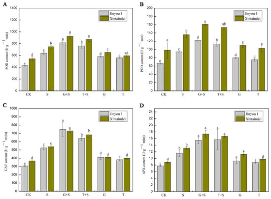 The activity of antioxidant enzymes is an important indicator reflecting the antioxidant capacity of plants. Salt stress significantly induces an increase in antioxidant enzyme activities (SOD, POD, CAT, APX) in cucumber seedlings, but there are differences among different varieties and sugar treatments. As shown in Figure 3A, compared with the control, the increase in SOD activity in the salt stress group (S) was higher in Jinyou 1 (49.5%) than in Xintaimici (37.8%), but the base value was lower. The G + S treatment further significantly increased SOD activity (23.6% in Xintaimici and 27.6% in Jinyou 1 compared with the S treatment group), while the increase in T + S was weaker (16.4% in Xintaimici and 19.1% in Jinyou 1), indicating that glucose is more effective in activating SOD. As shown in Figure 3B, compared with the control, the increase in POD activity in the salt stress group (S) was higher in Jinyou 1 (41.6%) than in Xintaimici (38.0%). The G + S treatment further increased POD activity (18.6% in Xintaimici and 29.3% in Jinyou 1 compared with the S treatment group), which was significantly better than T + S (12.9% in Xintaimici and 19.8% in Jinyou 1), indicating that glucose has a stronger induction effect on POD. As shown in Figure 3C, compared with the control, the increase in CAT activity in the salt stress group (S) was much higher in Jinyou 1 (71.6%) than in Xintaimici (46.7%). The G + S treatment significantly enhanced CAT activity (35.5% in Xintaimici and 42.8% in Jinyou 1), while the effect of T + S was weaker, especially in Jinyou 1, which decreased by 14.7%, and in Xintaimici, it decreased by 6.5%, indicating that sucrose has limited regulation on CAT. As shown in Figure 3D, the increase in APX activity in the salt stress group (S) was similar in both varieties compared with CK (48.5% to 49.3%). The G + S treatment significantly increased APX activity (32.1% in Xintaimici and 33.6% in Jinyou 1), and T + S was close but less stable. Moreover, the induction of APX by glucose alone was stronger in the salt-sensitive variety (Xintaimici) (26.8% increase in Xintaimici vs. 19.0% increase in Jinyou 1). The sucrose (T) alone treatment group showed a weak increase in both varieties (10.4% in Xintaimici and 13.0% in Jinyou 1) and was significantly lower than the G group (Figure 3D). In conclusion, under salt stress, exogenous glucose forms an “antioxidant compensation effect” by synergistically activating SOD, POD, CAT, and APX, especially for the salt-sensitive variety (Jinyou 1), where the increase in CAT activity was 42.8%. Sucrose focuses on osmotic regulation and has a weaker antioxidant induction effect. The salt-tolerant variety (Xintaimici) achieves defense enhancement through glucose (such as a 32.1% increase in APX activity). The differences among varieties suggest that the coupling of sugar signaling pathways and antioxidant systems has genetic specificity.