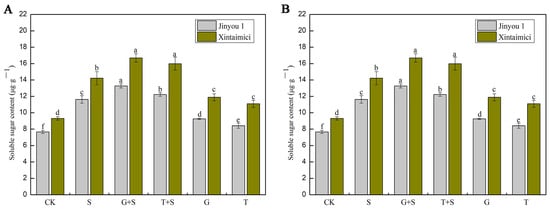 Soluble proteins in plant leaves play a crucial role in responding to salt stress. Under salt stress, the content of soluble proteins in plant leaves changes, which helps plants adapt to high-salt environments. The increase in certain soluble proteins can help plants maintain osmotic balance within cells and reduce the damage of salt to cell structures []. Under mild to moderate stress (such as low oxygen and moderate salt stress), exogenous sugars can provide carbon sources and energy needed for anabolic processes, promoting the accumulation of soluble proteins. As shown in Figure 4A, salt stress significantly affects the content of soluble proteins in cucumber leaves. Compared with CK, the increase in soluble protein content in the salt-tolerant variety Xintaimici (26.7%) is higher than that in the salt-sensitive variety JinYou 1 (10.9%). Under exogenous sugar intervention, compared with S, both glucose (G + S) and sucrose (T + S) can reduce excessive protein accumulation. In the G + S treatment, the decrease in Xintaimici is approximately 13.6%, but the alleviation for JinYou 1 is limited (7.9%). In the T + S treatment, the decrease in Xintaimici is approximately 13.5%, but the alleviation for JinYou 1 is limited (9.2%). When treated with individual sugars, glucose promotes an increase of 20.1% in the soluble protein content of Xintaimici compared with CK but inhibits JinYou 1 (a decrease of 5.8%), indicating that salt-tolerant varieties can effectively utilize exogenous sugars to maintain metabolic balance. Sucrose promotes an increase of 10.4% in the soluble protein content of Xintaimici, while the soluble protein content of JinYou 1 decreases by 2.9%. Soluble sugars are the basis of plant metabolism, providing energy and metabolic intermediates for plant growth and development and promoting seed germination and early seedling development. Under salt stress, plants accumulate soluble sugars to cope with osmotic stress, reduce osmotic potential, and thereby resist the damage of salt stress [,]. As shown in Figure 4B, compared with the control, soluble sugars accumulate significantly under salt stress (the increase in both varieties is >51%). Compared with the salt stress (S) group, the synergistic effect of glucose (G + S) is better than that of sucrose (Xintaimici G + S increased by 17.4% vs. T + S increased by 12.4%), while the JinYou 1 G + S group increased by 14.1%, and the T + S group increased by 5.1%. Under no stress conditions, exogenous sugars still slightly increase sugar content. In the glucose (G) group of Xintaimici, soluble sugars increased by 27.7% compared with CK, and in the glucose (G) group of JinYou 1, soluble sugars increased by 20.9% (Figure 4B). In conclusion, salt-tolerant varieties (Xintaimici) can effectively utilize exogenous sugars (especially glucose) to optimize the accumulation of osmotic adjustment substances (proteins and sugars), while salt-sensitive varieties (JinYou 1) have a weaker response and should prioritize glucose to enhance salt tolerance.