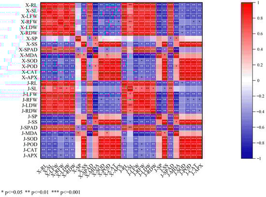 Correlation analysis matrix for each indicator. Note: X for Xintaimici. Root length for X-RL; stem length for X-SL; fresh weight of leaves for X-LFW; fresh weight of roots for X-RFW; dry weight of leaves for X-LDW; dry weight of roots for X-RDW; soluble protein for X-SP; soluble sugar for X-SS; relative chlorophyll content for X-SPAD; malondialdehyde for X-MDA; peroxidase for X-POD; catalase for X-CAT; superoxide dismutase for X-SOD; ascorbate peroxidase for X-APX. J for Jinyou1. Root length for J-RL; stem length for J-SL; fresh weight of leaves for J-LFW; fresh weight of roots for J-RFW; dry weight of leaves for J-LDW; dry weight of roots for J-RDW; soluble protein for J-SP; soluble sugar for J-SS; relative chlorophyll content for J-SPAD; malondialdehyde for J-MDA; peroxidase for J-POD; catalase for J-CAT; superoxide dismutase for J-SOD; ascorbate peroxidase for J-APX. * p ≤ 0.05, ** p ≤ 0.01, *** p ≤ 0.001. Red tones indicate positive correlations (positive correlation coefficients ranging from light red to dark red, corresponding to correlation coefficients from 0 to 1, with darker shades representing stronger positive correlations). Blue tones indicate negative correlations (negative correlation coefficients ranging from light blue to dark blue, corresponding to correlation coefficients from 0 to −1, with darker shades representing stronger negative correlations). White represents the absence of a statistically significant correlation (correlation coefficient close to 0 or non-significant correlation).