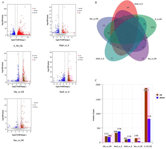 Transcriptional variation of cucumber plants under different treatments. (A) Volcano plots analysis of the DEGs in different treatments. (B) Venn diagrams showed the proportions of the up- and downregulated genes in three treatments. (C) The number of up- and downregulated genes in different treatments.