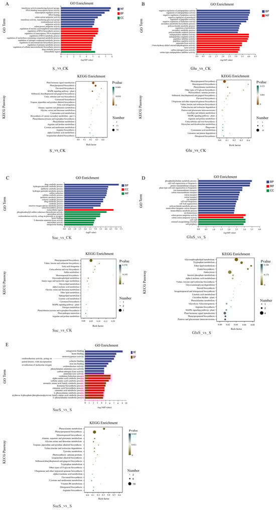 Enrichment analysis of transcriptional variation in cucumber plants under different treatments. (A) GO enrichment and KEGG analysis in S_vs_CK. (B) GO enrichment and KEGG analysis in Glu_vs_CK. (C) GO enrichment and KEGG analysis in Suc_vs_CK. (D) GO enrichment and KEGG analysis in GluS_vs_S. (E) GO enrichment and KEGG analysis in SucS_vs_S.