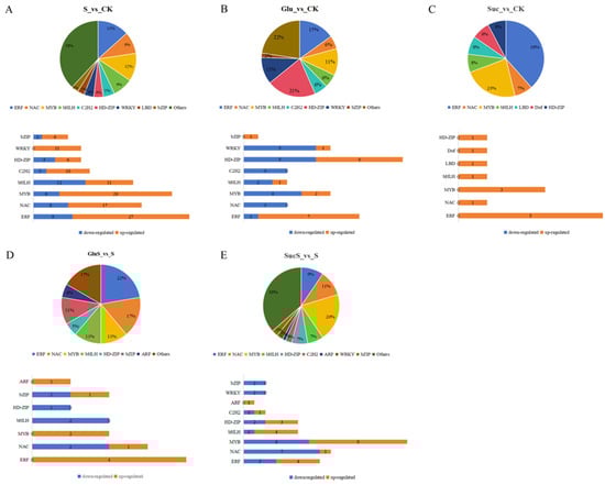 Distribution of transcription factor gene families expressed in different comparison groups. The pie chart shows the proportion of transcription factors in different comparison groups among the total transcription factors, while the bar chart presents the number of up-regulated and down-regulated transcription factor genes in the main comparison groups. The results of (A) S_vs_CK, (B) Glu_vs_CK, (C) Suc_vs_CK, (D) GluS_vs_S and (E) SucS_vs_S are respectively displayed in the figure.