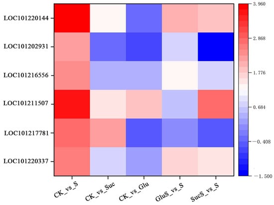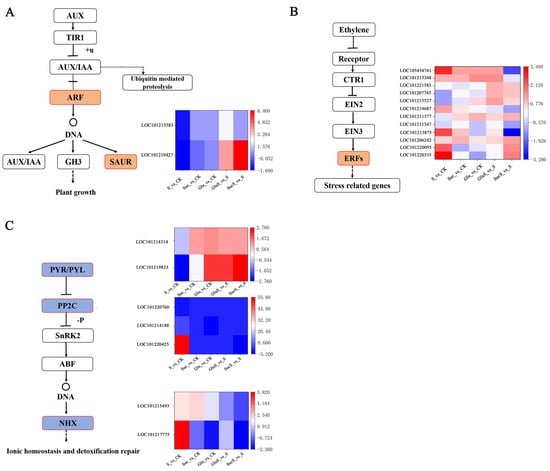 Based on the KEGG enrichment analysis, we further examined differentially expressed genes associated with the plant hormone signal transduction pathway (ko04075) in the comparisons between treatment and control groups. Particular attention was given to expression patterns of key hormones—auxin, ethylene, and abscisic acid—in cucumber leaves. Auxin, a small-molecule organic acid, plays a crucial role in plant growth and development by regulating processes such as cell division, elongation, and differentiation. Several studies have reported that auxin signaling mutants exhibit altered responses to environmental stresses, including heat, drought, and salinity [,]. In our study, ARF (auxin response factor), functioning as a transcriptional activator of auxin-regulated genes (LOC101219427), was significantly upregulated in both GluS_vs_S and SucS_vs_S treatments. Additionally, an auxin-responsive protein, SAUR71-like (LOC101213583), was also found to be upregulated under these two treatment conditions (Figure 9A).