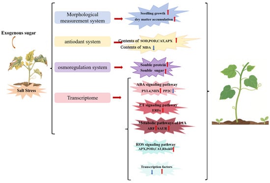 Schematic representation of the strategy of exogenous sugar to alleviate salt stress in cucumber seedlings. Red arrows denote an increase in the content of physiological indicators or up-regulated gene expression, whereas blue arrows denote a decrease in the content of physiological indicators or down-regulated gene expression.