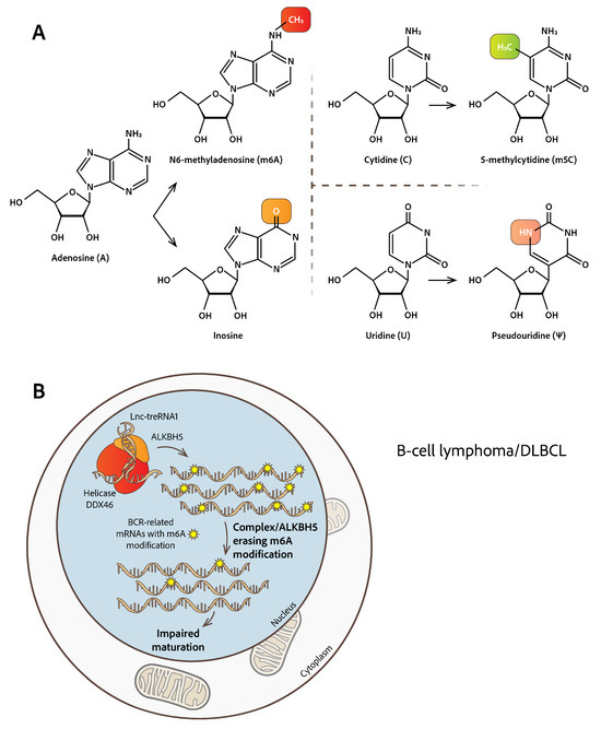 RNA base modifications and m6A modification role in B-cell lymphoma. (A) Chemical structures of selected RNA modifications including N6-methyladenosine (m6A), 5-methylcytidine (m5C), inosine (I), and pseudouridine (Ψ). (B) In B-cell lymphoma, m6A demethylase ALKBH5, lncRNA-treRNA1 and the RNA helicase DDX46 form a functional complex in the cell nucleus, affecting the removal of m6A modifications from key BCR-related transcripts with severe consequences to B-cell functionality. Also, ALKBH5 is frequently enhanced in human DLBCL and demethylates BCR signature transcripts, guiding lymphomagenesis.
