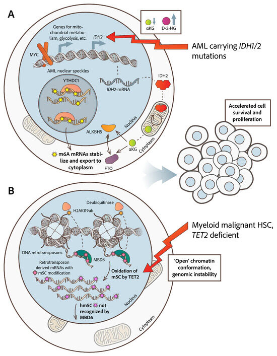 Altered RNA modification pathways in myeloid malignancies. (A) In AML, ALKBH5 and FTO are αKG-dependent enzymes and are inhibited by the high accumulation of D-2-HG, an alternative metabolite produced by IDH1/2 mutants, leading to a m6A hypermethylation profile. MYC transcriptionally activates the IDH2 promoter along with various other enzymes’ promoters which positively influence anaplerotic mitochondrial metabolism, glycolysis, and glucose transport, leading to an increased αKG cellular pool, suggesting its critical role in nuclear–mitochondrial crosstalk. Increased levels of the m6A ‘reader’ YTHDC1 in AML leads to the formation of nuclear speckles, protecting m6A-mRNAs from degradation. Protection and stabilization of m6A transcripts accelerates cells’ survival and proliferation. (B) In AML with mutated TET2, oxidation of m5C, especially in RNAs derived from retrotransposons, fails. Remaining m5C marks in RNA recruit MBD6 and deubiquitinases which remove mono-ubiquitination from H2AK119ub, leading to open chromatin status, increased transcription of retrotransposons, and genomic instability, all hallmarks of cells’ cancer state.