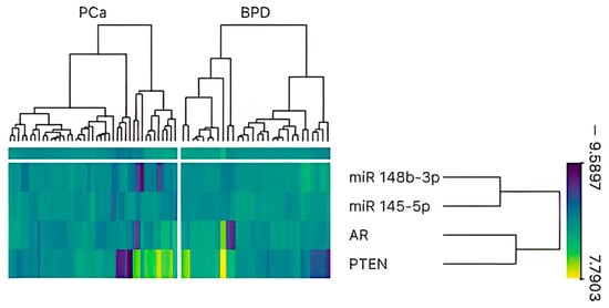Heatmap and hierarchical clustering analysis of miR-145-5p, miR-148b-3p, AR, and PTEN expression in prostate tissue samples (n = 71). Columns represent individual samples categorized into two groups: prostate cancer (PCa) and benign prostate disease (BPD). Rows correspond to normalized expression levels of the selected genes and miRNAs. Color scale indicates expression intensity, with yellow representing high expression and purple indicating low expression. Hierarchical clustering reveals distinct expression patterns between PCa and BPD groups, with a tendency toward reduced expression of miR-145-5p and miR-148b-3p and increased expression of AR and PTEN in PCa samples.