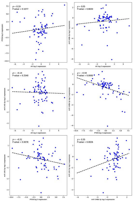 Scatter plots showing Spearman correlation analyses between log2-transformed expression levels of miR-145-5p and miR-148b-3p and those of AR and PTEN in prostate tissue samples (n = 71). Each dot represents an individual sample. Dashed lines indicate linear regression trends for visualization. Statistically significant inverse correlations were observed between PTEN and both miR-145-5p (ρ = −0.31, p = 0.0078) and miR-148b-3p (ρ = −0.35, p = 0.0026). No significant correlations were found between either of these miRNAs and AR expression.
