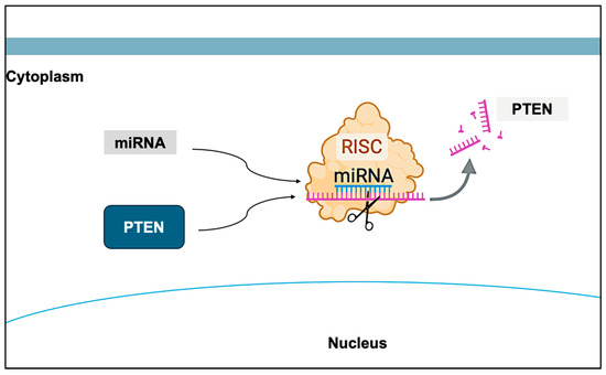 Effect of miRNAs on PTEN. The expression of PTEN can be influenced by epigenetic factors, such as miRNAs, which act as post-transcriptional regulators of PTEN. Created with BioRender.com.