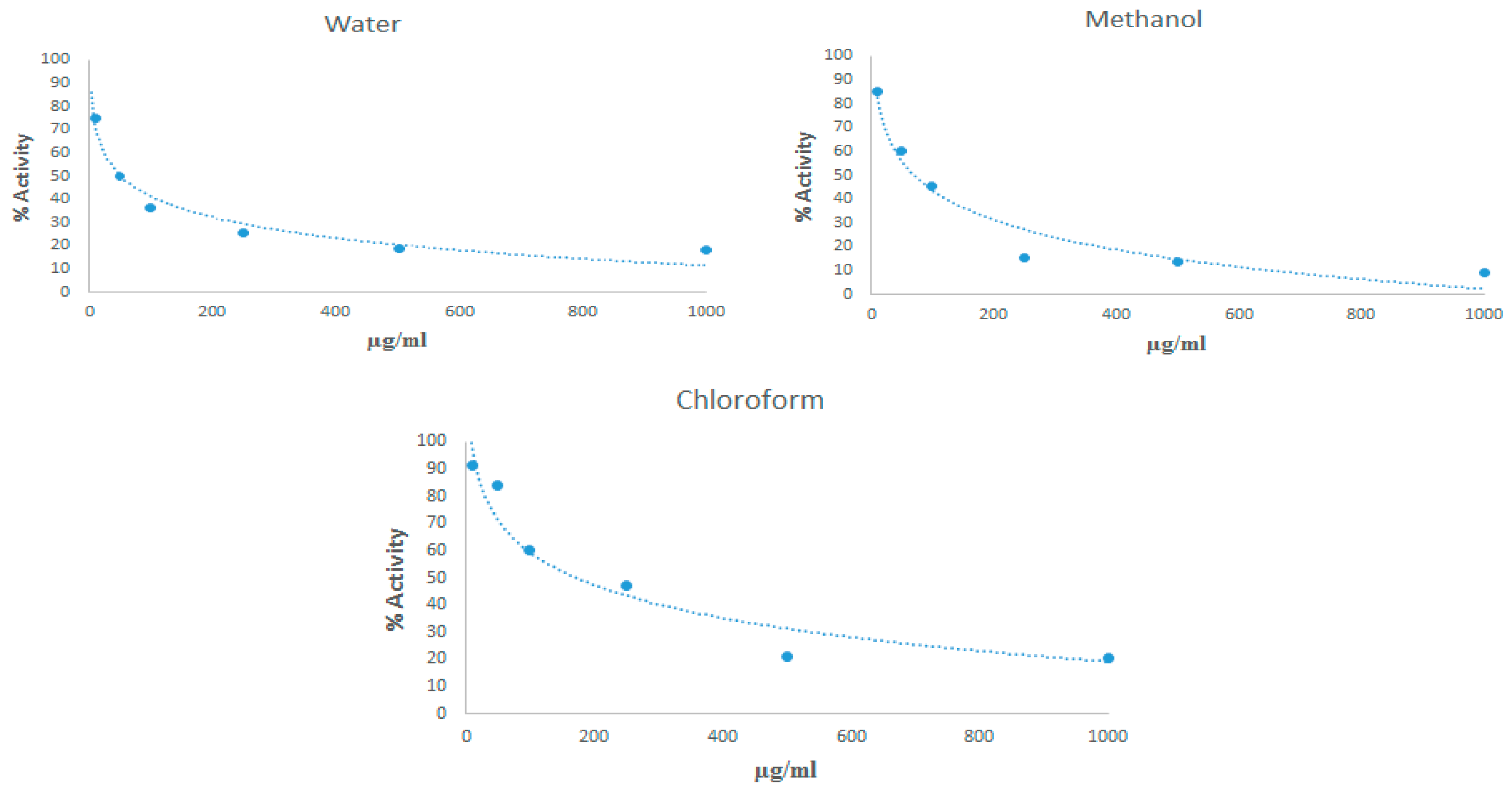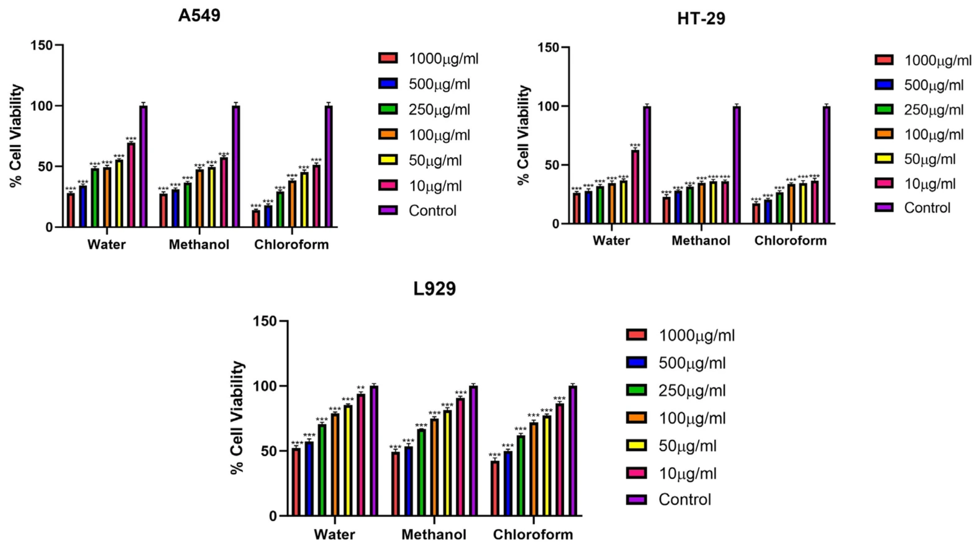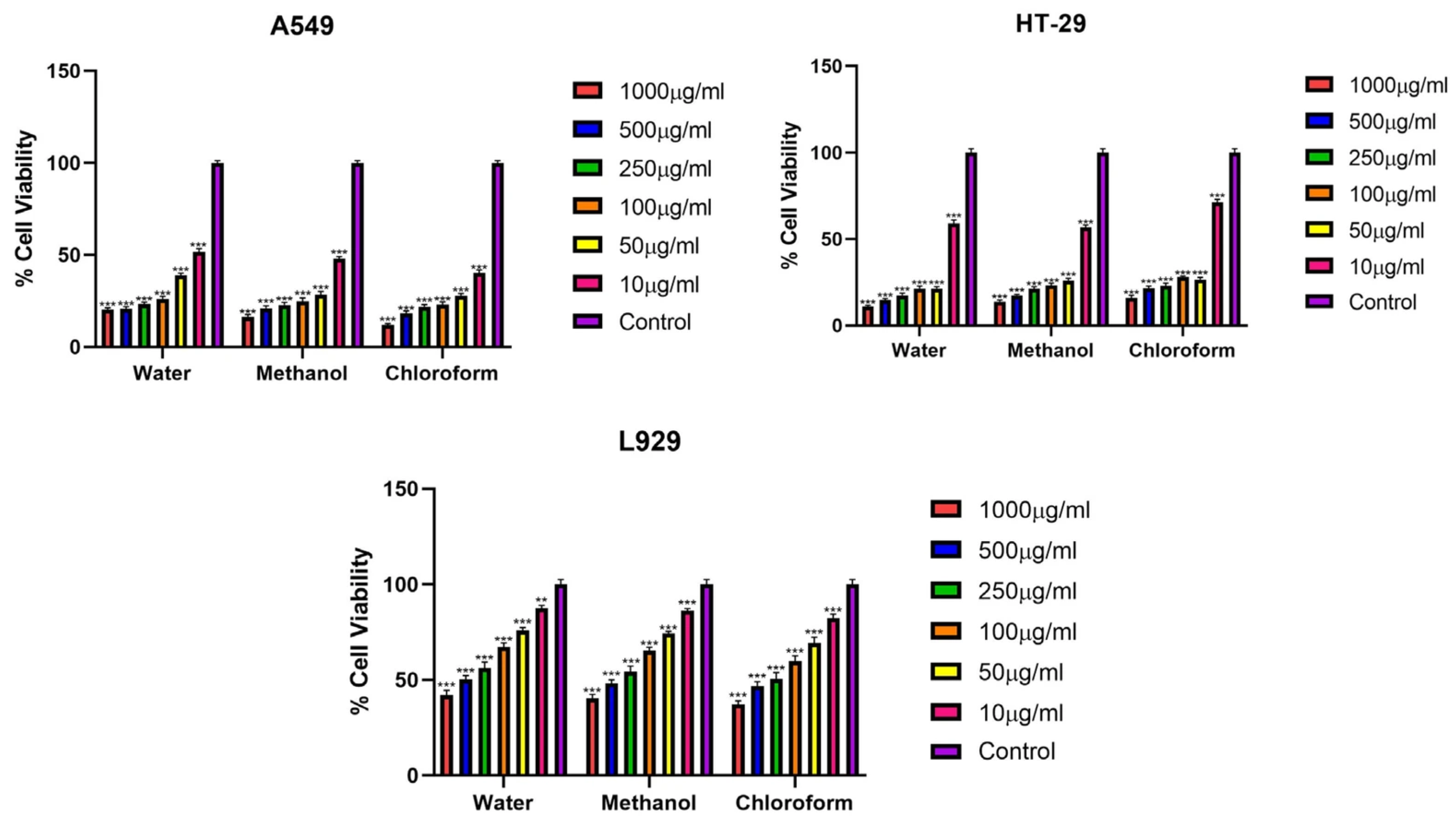 | Water | 10.91 μg/mL | 12.81 μg/mL | 481.70 μg/mL |
