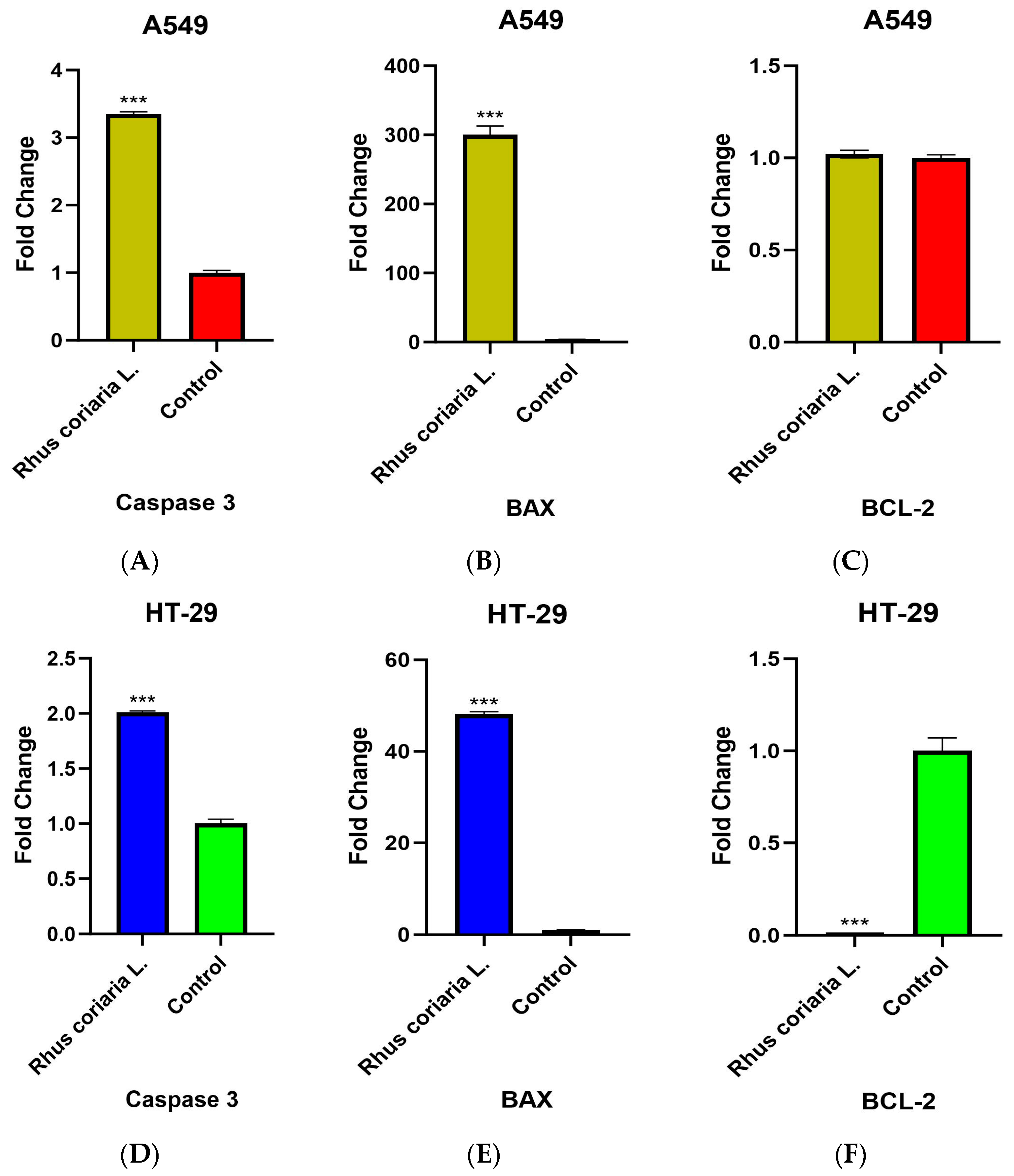 - Gabr, S.A.; Alghadir, A.H. Potential anticancer activities of Rhus coriaria (sumac) extract against human cancer cell lines. Biosci. Rep. 2021, 41, BSR20204384. [Google Scholar] [CrossRef] [PubMed]