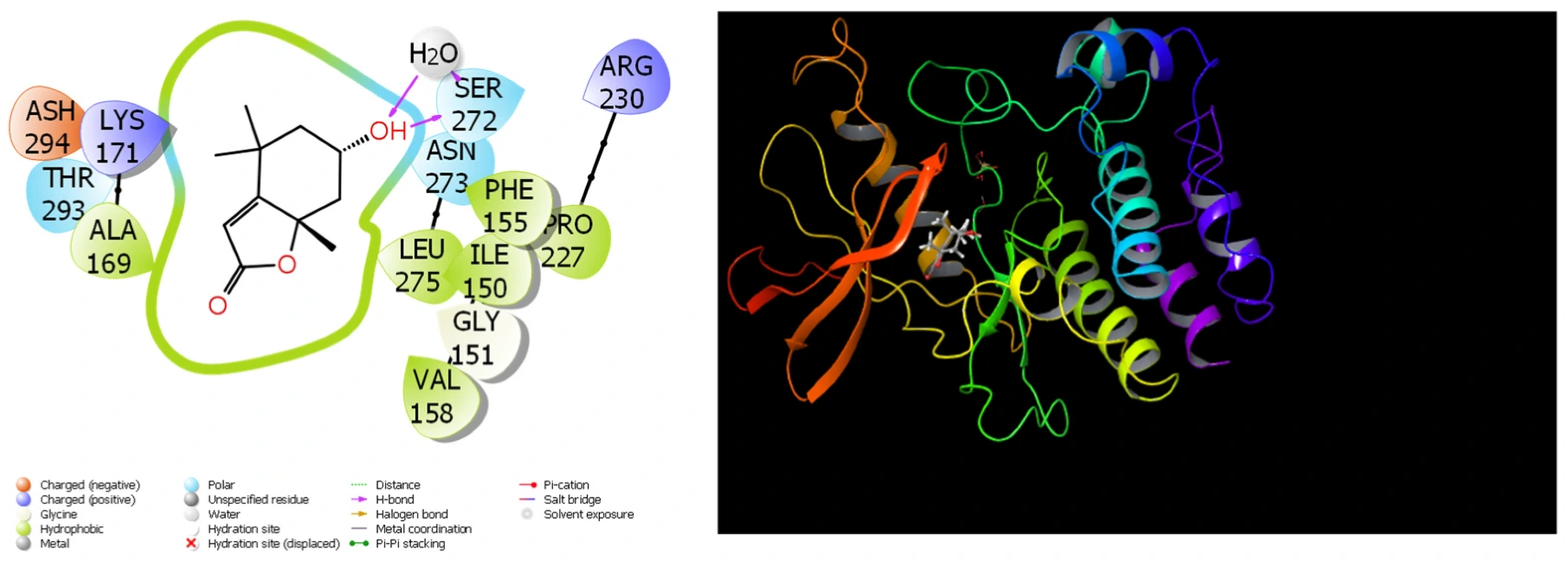 | (−)-Loliolide | −5.55 | −0.40 | 0.00 | −16.69 | −13.94 | −44.26 | −30.63 | 0.35 | 136 |
