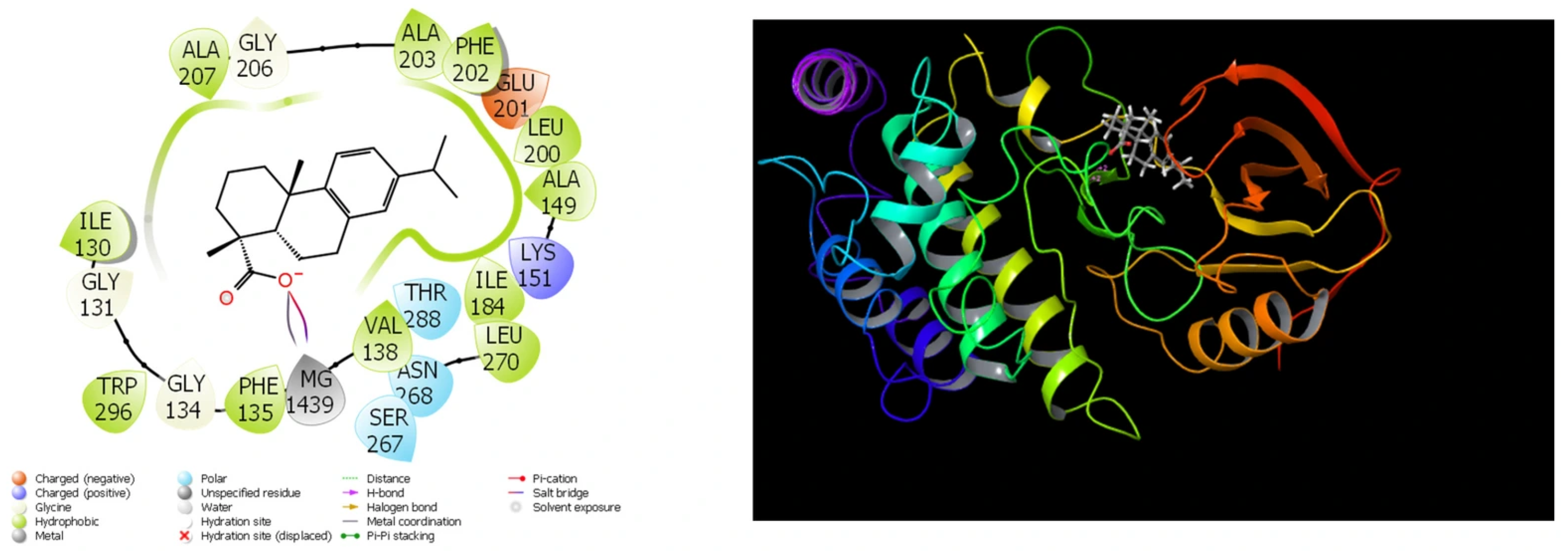 | DEHYDROABIETIC ACID | −9.64 | −0.44 | 0.00 | −22.05 | −13.40 | −82.65 | −35.46 | 3.73 | 334 |