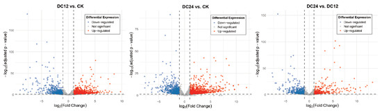 To visually represent the significance and direction of expression changes, volcano plots were generated for the DC12 vs. CK, DC24 vs. CK, and DC24 vs. DC12 (Figure 3) comparisons. These plots highlighted significantly upregulated (red) and downregulated (blue) genes. Based on the sample groupings (with the CK group as control and DC12/DC24 as treatment groups), low-expression genes were filtered out, retaining only genes with counts ≥10 in at least two samples. For the pairwise comparisons of DC12 vs. CK and DC24 vs. CK, differentially expressed genes (DEGs) were identified using the thresholds of adjusted p-value (padj) < 0.05 and absolute log2 fold change (|log2FC|) ≥ 1. The analysis revealed 2103 DEGs in the DC12 vs. CK comparison, consisting of 1267 upregulated and 836 downregulated genes. The DC24 vs. CK comparison identified 2055 DEGs, with 1211 upregulated and 844 downregulated genes. The DC24 vs. DC12 comparison detected 1044 DEGs, of which 484 were upregulated and 560 were downregulated. Among these, 15 were consistently upregulated and 9 were downregulated genes across all post-inoculation time points, while the union comprised 3823 DEGs, out of a total background of 21,782 analyzed genes (Figure S1).