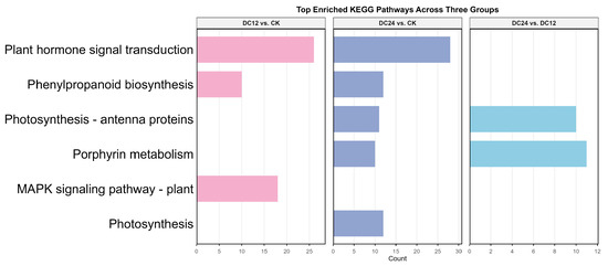 Enriched KEGG pathways across comparison groups. The bar charts display the number of differentially expressed genes annotated to each pathway. Colors represent the different comparison groups: pink (DC12 vs. CK), purple (DC24 vs. CK), and blue (DC24 vs. DC12). Only pathways with a Benjamini–Hochberg adjusted p-value < 0.05 are shown.