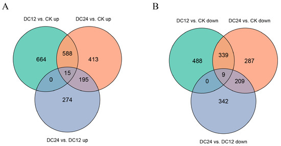 For downregulated DEGs, similar analysis showed 339 genes commonly downregulated in both DC12 vs. CK and DC24 vs. CK, 287 genes shared between DC24 vs. CK and DC24 vs. DC12, and 209 genes co-downregulated in DC12 vs. CK and DC24 vs. DC12. Only nine genes maintained consistent downregulation across all three comparisons. The uniquely downregulated genes were 488 for DC12 vs. CK, 287 for DC24 vs. CK, and 342 for DC24 vs. DC12, respectively.