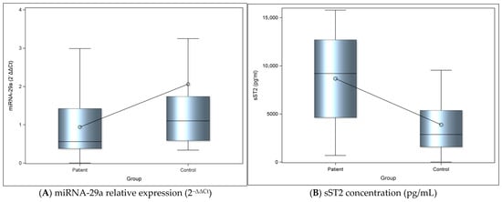 (A) The graph depicts the relative expression levels of miRNA-29a between groups. Bars represent mean values and error bars indicate standard deviation. Dots represent the averages. (B) The graph represents levels of sST2 between groups. Bars represent mean values, and error bars indicate standard deviation. Dots represent the mean of each group.