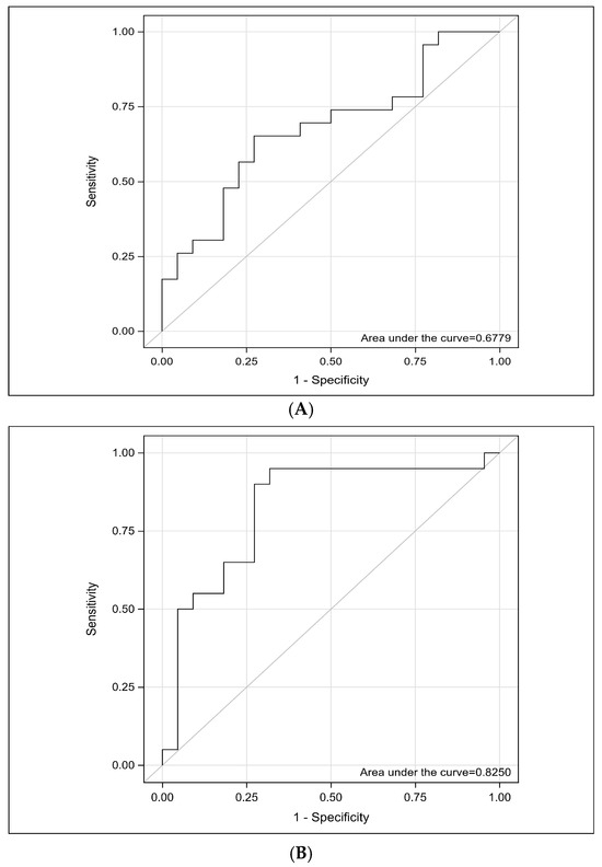 The ability of the miRNA-29a biomarker to distinguish patients with ovarian cancer from healthy individuals was evaluated using the ROC curve and AUC value. The optimal threshold for 2−ΔΔCt, along with sensitivity and specificity, was calculated. An empirical ROC curve was generated using a non-parametric method in SAS software. The analysis yielded an AUC value of 0.678, with a 95% CI of 0.5180–0.8377 and a significance level of p = 0.027 (Table 3). These findings indicate that miRNA-29a 2−ΔΔCt has a statistically significant discriminatory power in differentiating patients from healthy individuals (Figure 2A).