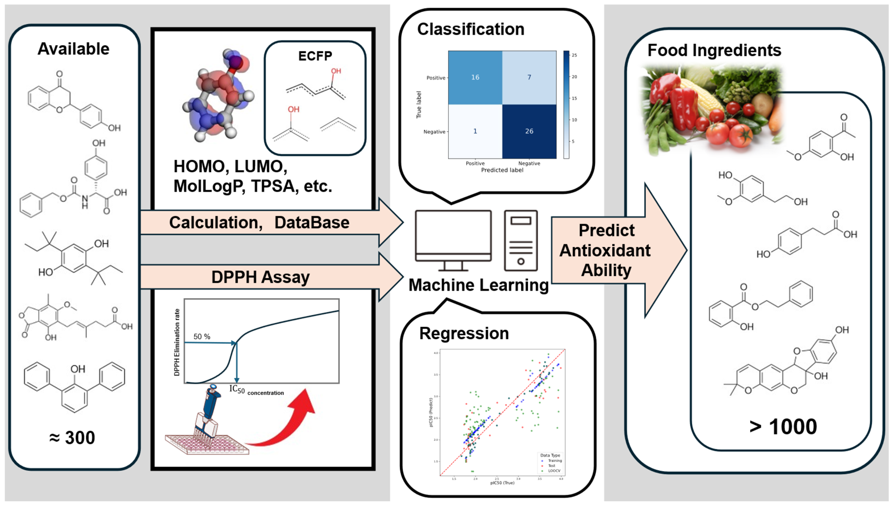 Regarding the evaluation metrics used for the classification models, each metric has inherent limitations. Accuracy is sensitive to class imbalance and may overestimate performance for the majority class. The F1 score, defined as the harmonic mean of precision and recall, does not consider true negatives and therefore does not fully reflect the model’s ability to correctly exclude inactive compounds. Although the MCC incorporates all elements of the confusion matrix and is relatively robust to class imbalance, its value can become unstable when applied to relatively small datasets, such as those evaluated using LOOCV, and should therefore be interpreted with caution. The regression prediction model constructed in this study showed high adaptability for compounds containing only one phenolic hydroxyl group; however, its predictive accuracy could be improved by incorporating more complex descriptors, such as bond dissociation energy and acidity constant, as well as by expanding the dataset. Furthermore, the model cannot be applied to compounds with two or more phenolic hydroxyl groups, which are major contributors to antioxidant capacity. Therefore, to quantify the antioxidant capacities of foods more comprehensively, it is essential to include compounds with multiple hydroxyl groups in the model. While the descriptors and non-deep learning models currently in use may not be able to fully reflect the DPPH activity of these compounds, the introduction of machine learning methods with excellent nonlinear feature extraction capabilities, such as deep learning, is expected to enable more accurate handling of a wider variety of phenols for accurate prediction, albeit at the cost of interpretability. The results of this study lay the foundation for this and, in the future, it may be possible to develop a platform for comprehensively predicting and comparing the antioxidant capacities of a wide range of phenolic compounds in foods. Previous studies (e.g., [15]) have shown that the sum of the antioxidant capacities of food components is almost equal to the antioxidant capacity of the food itself. We believe that by predicting the antioxidant capacity of food components, it is possible to predict the antioxidant capacity of the food itself.