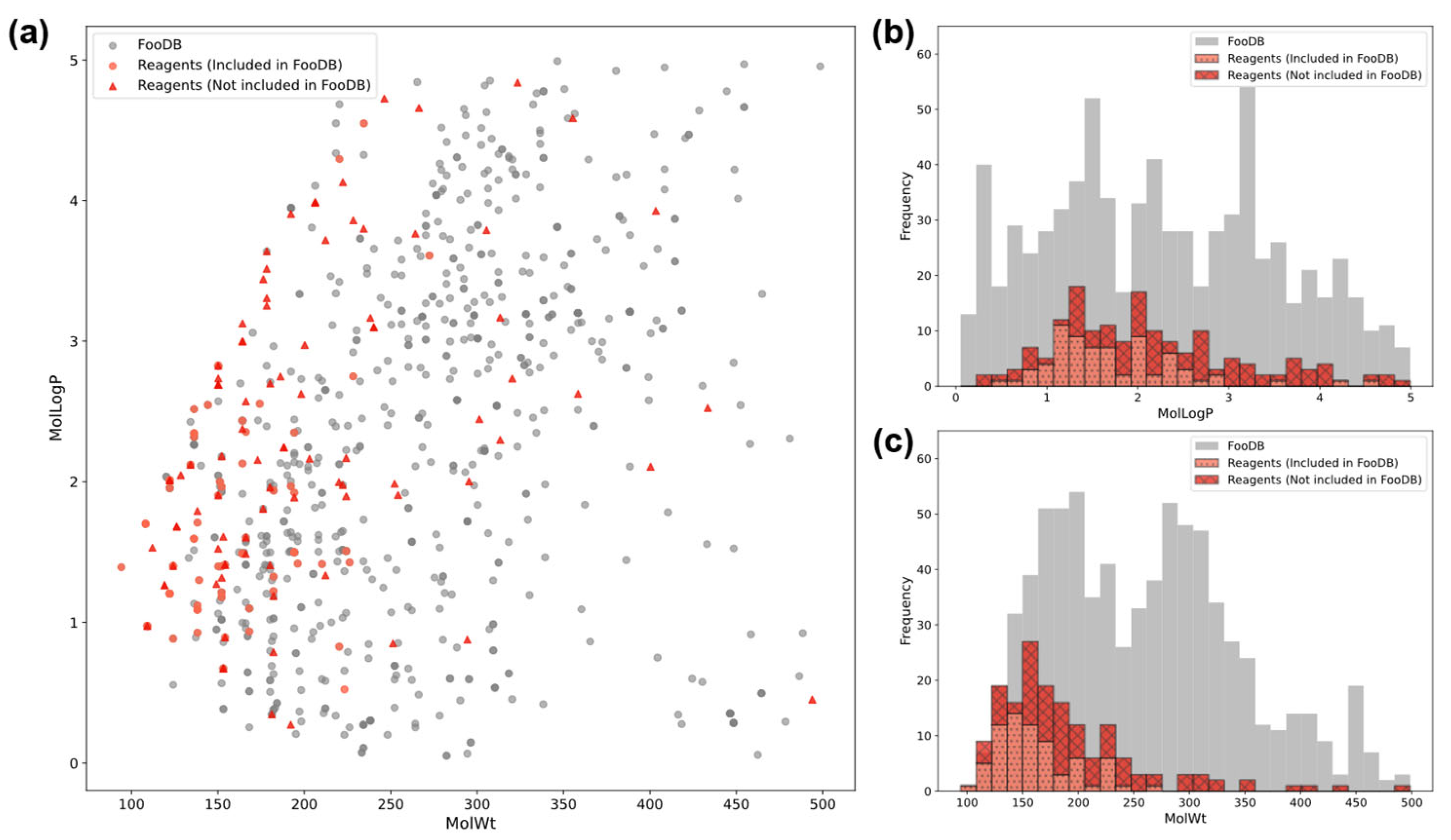 Figure 3. Relationship between compounds containing one phenolic hydroxyl group in the measurement dataset and compounds containing one phenolic hydroxyl group in the FooDB dataset. (a): Molecular weight-MolLogP plot, (b): MolLogP histogram, (c): molecular weight histogram. Histograms were stacked, with the total height representing the total number of samples.