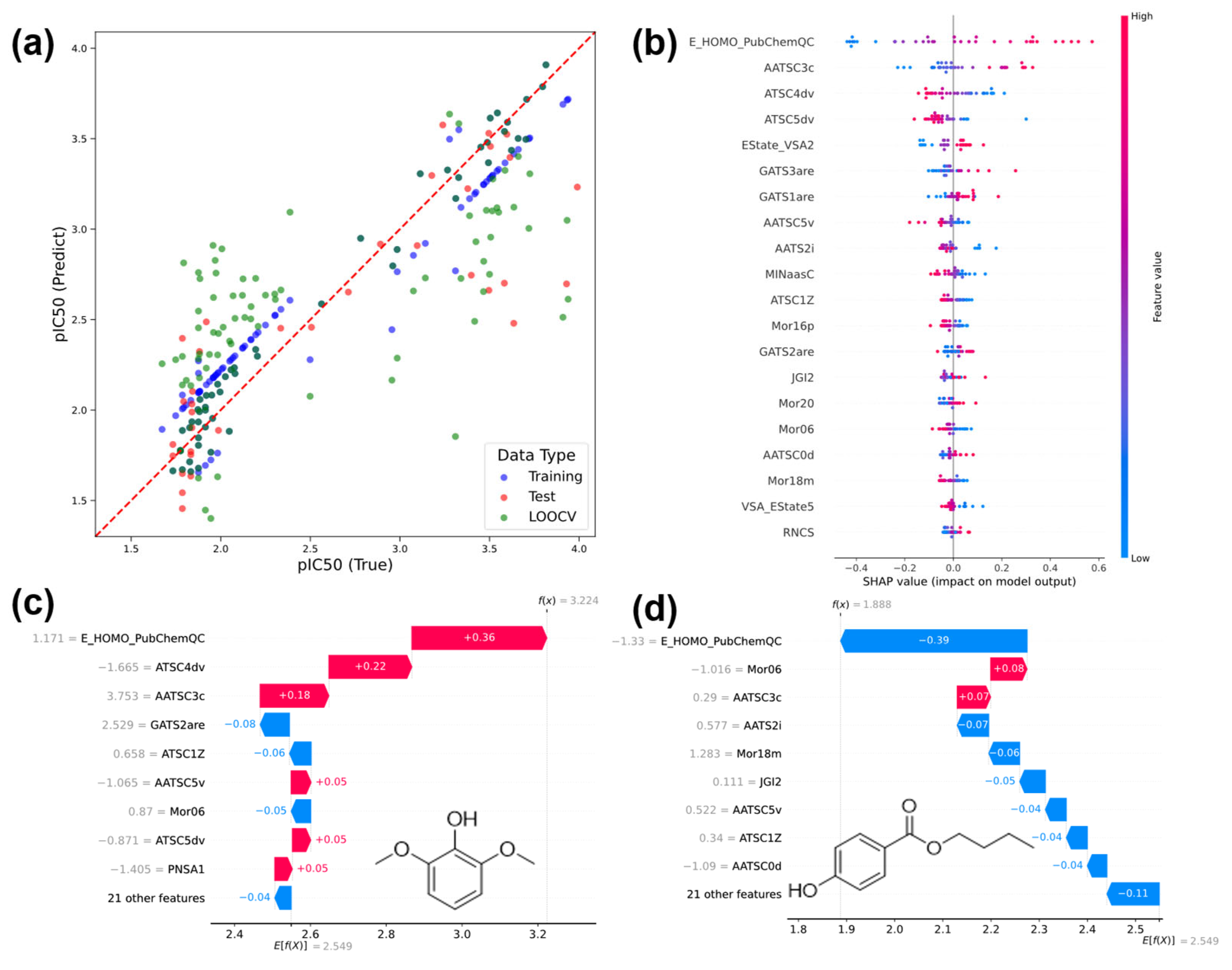 Figure 6. (a): YY plot of SVR_PubChemQC, (b): SHAP-summary-plot of SVM_PubChemQC, (c): SHAP analysis of 2,6-dimethoxyphenol, (d): SHAP analysis of 4-hydroxybenzoic acid butyl ester.